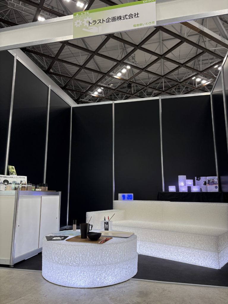 今年は3Dクッション素材とバイオマス樹脂製品の展示を致しました。